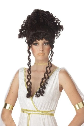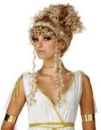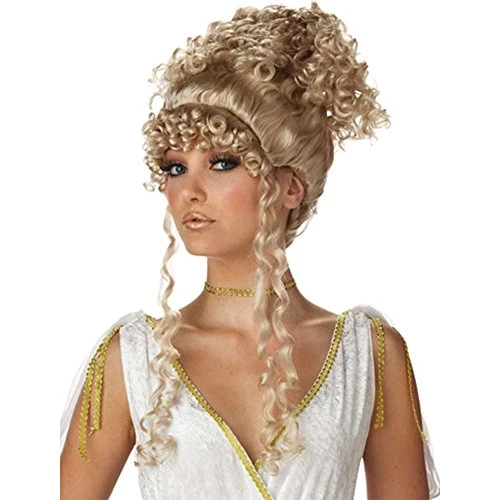 Golden blonde hair w/ ringlet bangs, curly ponytail and long spiral strands down each side