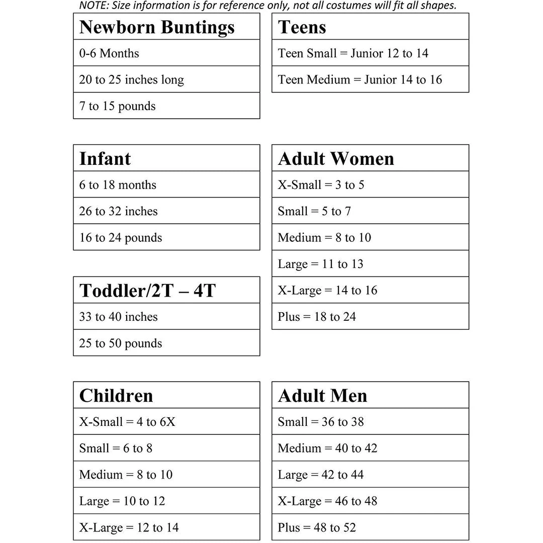 - Costumes are sized differently than clothing, important to consult Charades costume chart before making selection