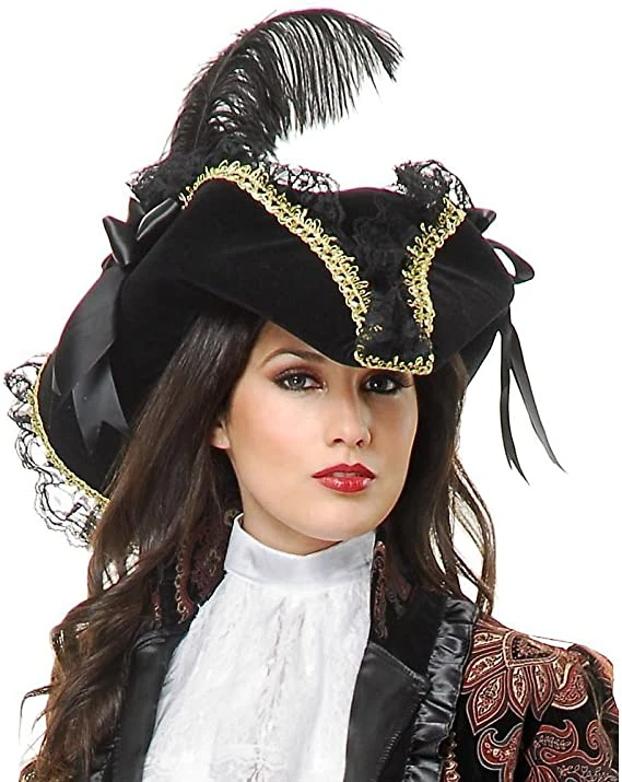 Black Velvet Lacey Pirate Hat with Feather and Gold Trim