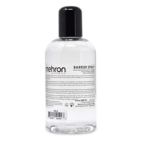 Barrier spray is a clear liquid that sets makeup designs & protects sensitive skin from latex & adhesives. Great for all makeup applications such as, modeling, TV, stage, clowning, face painting, Halloween, special effects & photography.