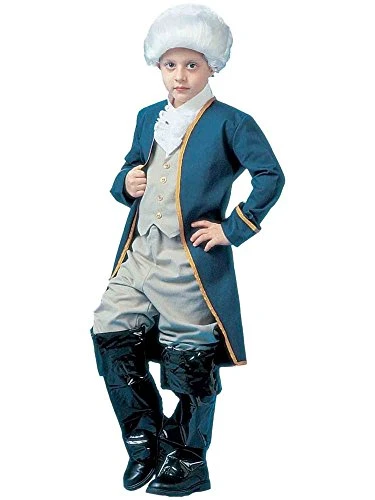 What’s the big deal? It’s only a cherry tree! This George Washington costume features the familiar colonial-style collarless knee-length jacket with attached jabot, gold trim and cuff details, colonial beige vest, and matching elastic-hemmed knee-length knocker-style trousers.