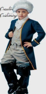 Includes: Long Blue 3/4 length jacket accented w/gold trim, tan knickers & vest w/gold button detail & attached white ruffled Lace Jabot.