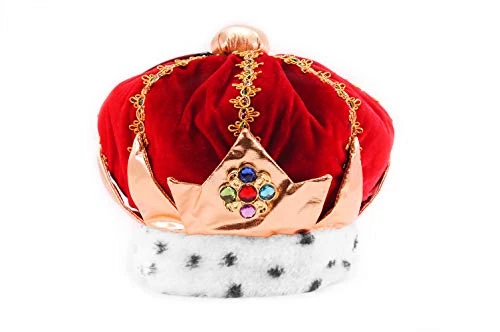 This vibrant red and gold crown is accented in bright, multi-colored plastic jewels and faux ocelot fur for that authentic regal look. Fabric lining, secret pocket with fortune.