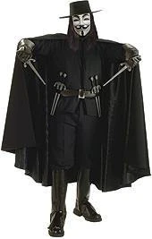Includes: Shirt, pants, boot tops, hat, cape, belt with 6 daggers & mask.