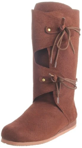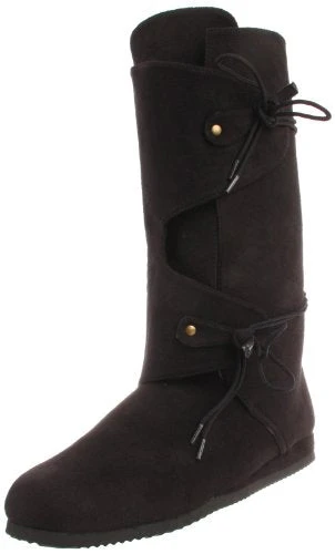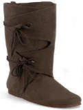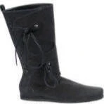 Good quality black imitation suede Buckskin boot w/black kid like imitation leather lining & soft foot pad. Two side laces & flaps w/wide rawhide like ties & chrome studs.