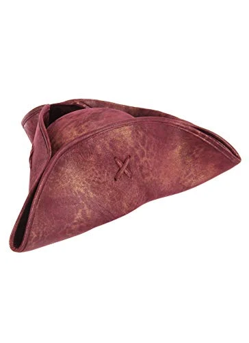 Good for Caribbean Pirate & 18th Century Characters. Authentic, Distressed Faux Leather, blocked tricorn hat that is made the old world way, by pressing the material around a shaped block.