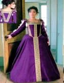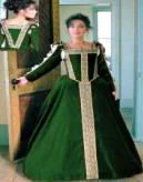 Reproduction of the gown worn by Eleanor of Toledo when she was laid to rest. Eleanor was the wife of Grand Duke Cosimo I of the Italian Medici family. She held a noble station in society which she showed in her clothes. Twenty-eight pearl buttons line the sleeves which are slashed to show her Silk Chemise poufs through. Her bust line is flattened & lifted by her Corset. Her Bumroll & Hoopskirt make her skirts lay larger to give the illusion of a smaller waist without the body alterations practiced by the Victorians.