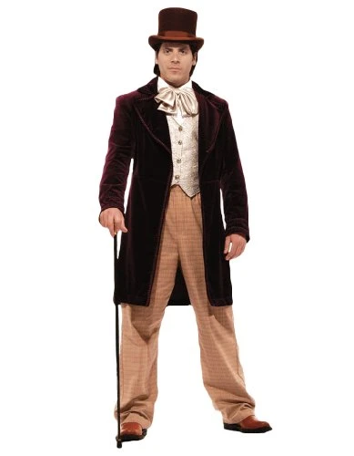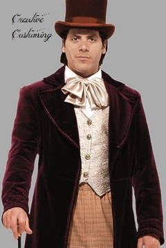Includes: Tasteful deep purple velvet frock coat, contrasting brocade vest, plaid trousers w/seam pockets & ascot tie.Â