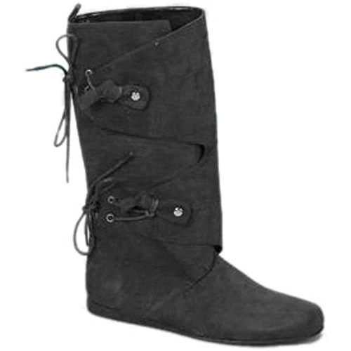 Very good quality brown imitation suede Buckskin boot with brown kid like imitation leather lining and soft foot pad. Two heavy duty side laces and flaps with wide rawhide like ties and chrome studs. This boot works for a variety of characters including Hippies, medieval & renaissance woman, Native Americans, Mountain Woman, early American & European Explorers.