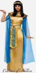 Includes: Gold satin gown with attached sheer chiffon shoulder drape & metallic gold belt, matching Egyptian collar & headband.
