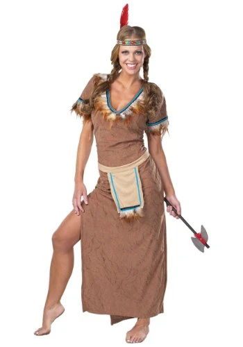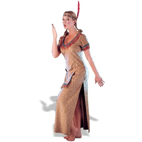 Includes: Full-length textured animal print faux suede dress with double side high leg slits, adjustable lacing in back (for improved fit), feather, turquoise & black velvet trim at neck & arms, attached contrasting apron with elegant overlaying feather & ribbon trim, colorful one-size ribbon headband with feather.