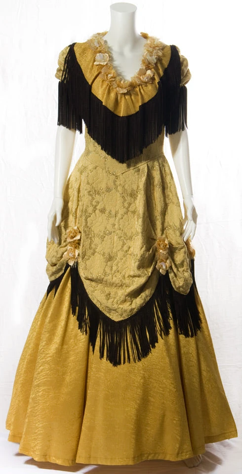 Includes: Yellow/Gold dress w/floral brocade bodice, puffed sleeves, fitted waist, crinkled satin underskirt, overskirt accented w/ruffles, matching neck detail w/black fringe, silk flowers & feathers.