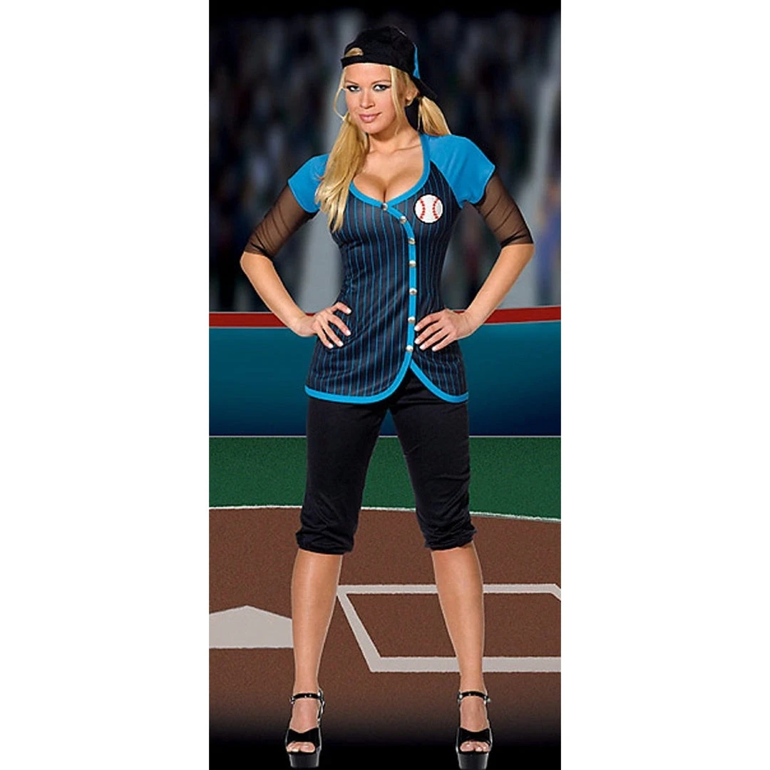 If you’re looking for a home run, this is your costume. Stretch knit asymmetrical shirt with fishnet double sleeve and matching stretch knit cropped pant. Includes matching baseball hat. (3 piece set)