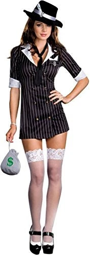 Pinstripe knit double breasted snap front dress with contrast collar and cuffs and rhinestone dollar sign charm. Includes hat with faux dollar bill, knit tie and drawstring bag. (4 piece set)