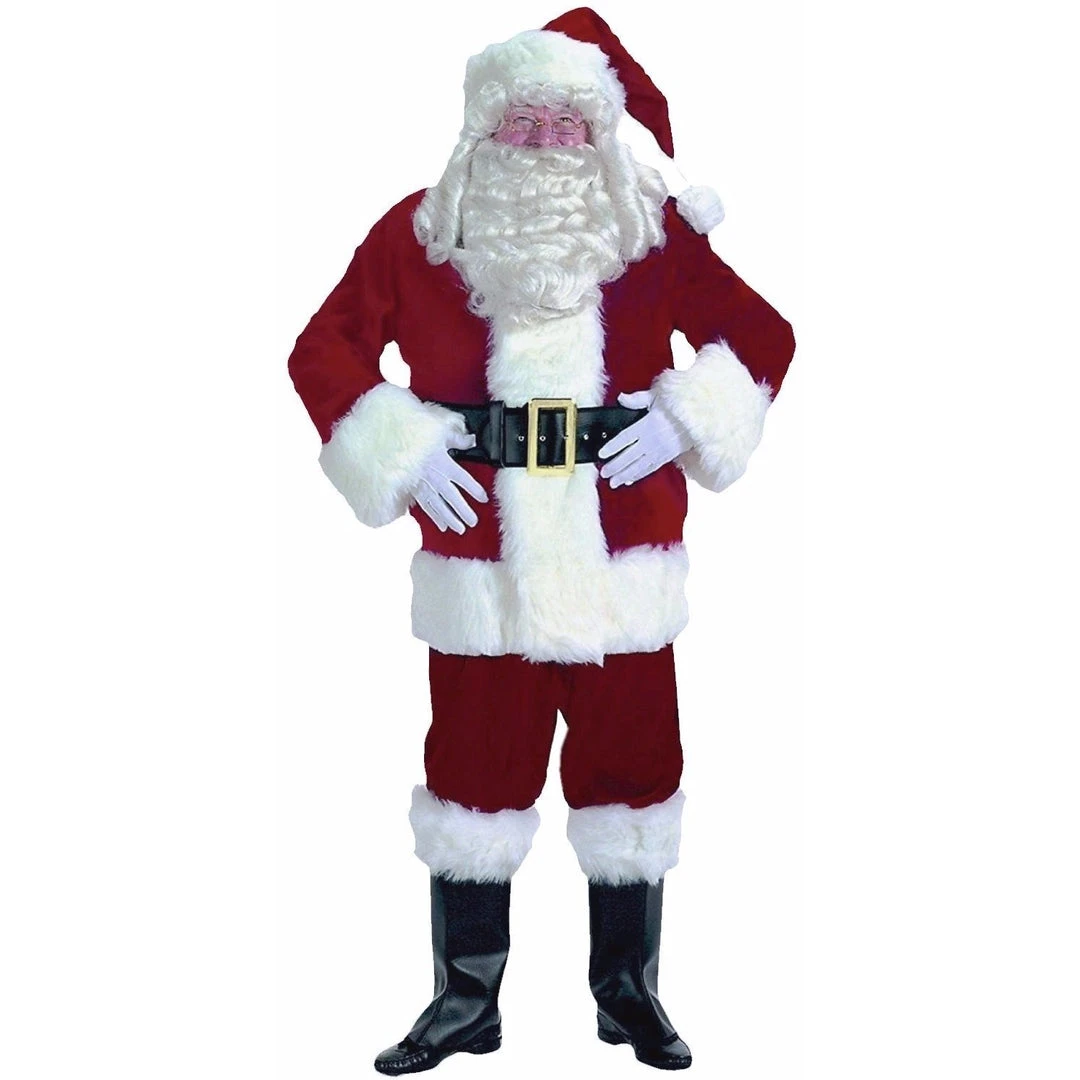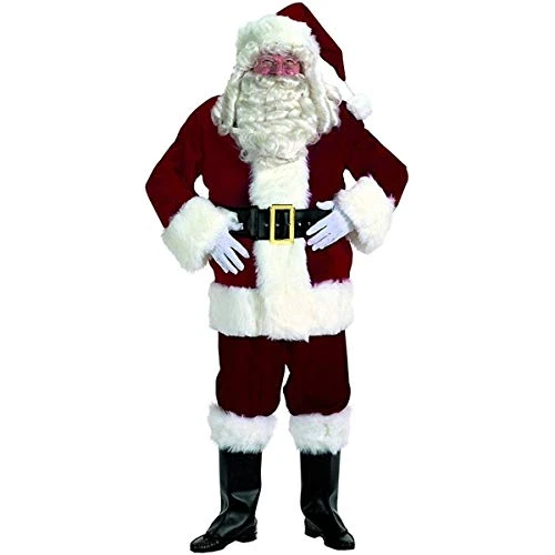 Includes Includes: Exquisite Deep Red/Burgundy poly/cotton velvet front zipper coat accented w/luxurious white long-hair plush trim, lengthened coat border & belt loops, matching pants w/side pocket, hat w/large pom-pom, Naugahyde bound belt (w/eyelets, gilt buckle w/prong & loop), Naugahyde boot tops w/long-hair plush cuffs & white nylon Santa gloves. jacket, pants, hat, belt, gloves, and boot tops.