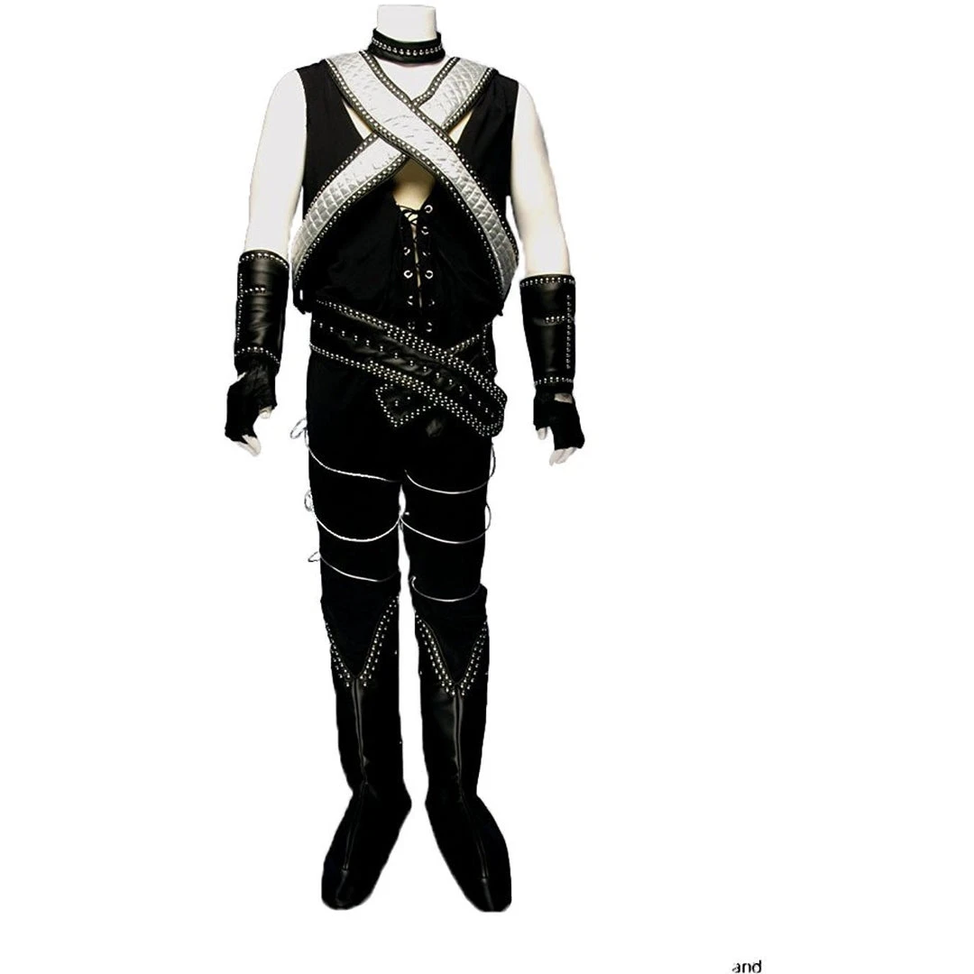 - Includes studded leatherette shoulder belt, waist belt, cuffs, boot covers, and choker