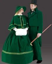 Includes: Velvet skirt w/gold trim, reversible velvet cape (inside plaid taffeta), , faux fur muff & matching velvet hat. 4 pc ensemble.