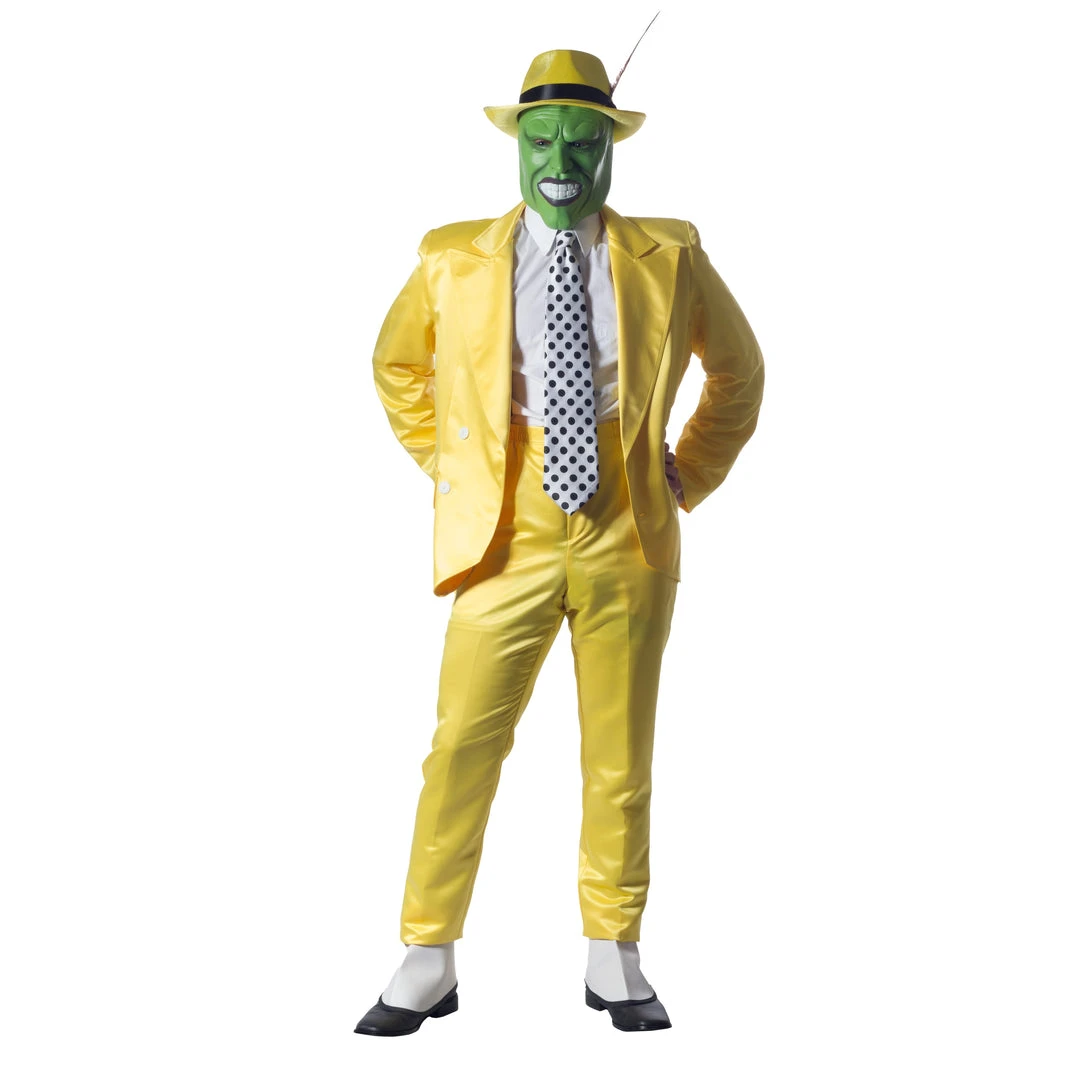 Enjoy Halloween this year with Jim Carrey’s The Mask costume! Includes Yellow Polyester Tuxedo Suit accented with white buttons and mock pockets, Double breasted front closure & matching elastic pants. Black and white tie, suspenders, spats are included as well as the hat with peacock feather!