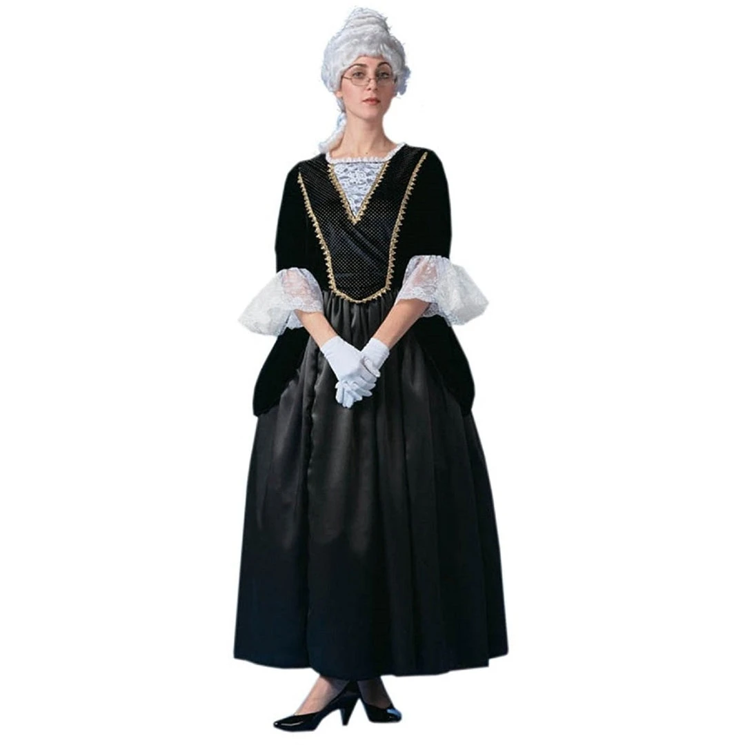 Mrs. Benjamin Franklin Colonial Woman Deluxe Costume Mrs. Franklin – circa mid 1700’s Stock #PA6567 Includes: Colonial style skirt & blouse accented w/white ruffle lace at sleeves & neckline & gold trim. Color: Black/Gold (shown) Misses Size: Std (4-10)