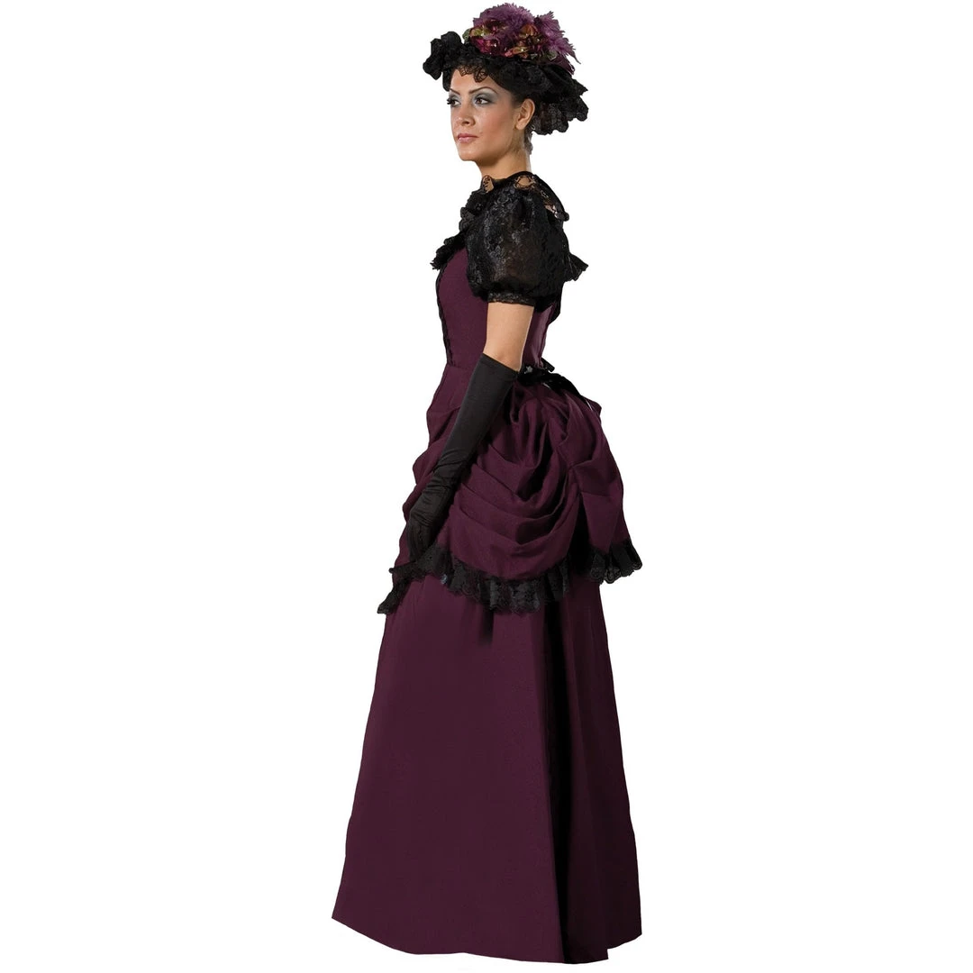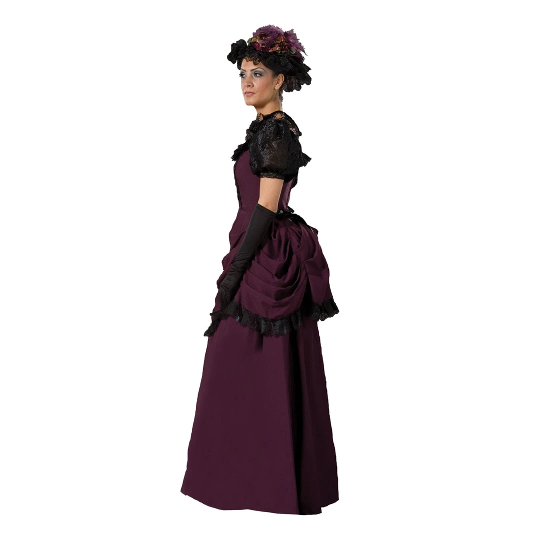 Includes: Classic gown in satin back crepe w/contrasting black trim & bustle (hip pillow)
