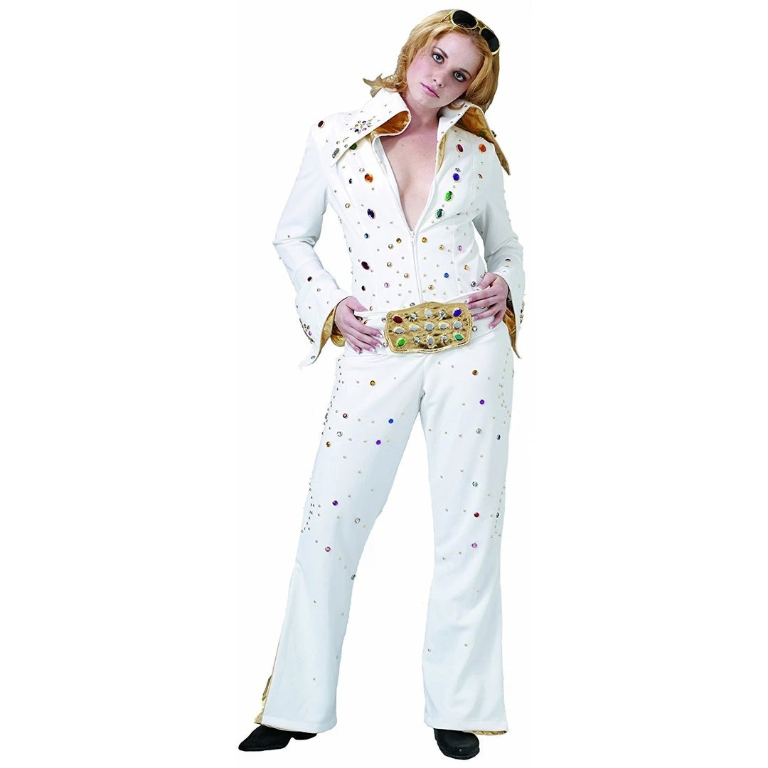 Includes: Sensational jumpsuit decorated w/multi-colored rhinestones & gold studs, high collar, bell bottom pants gold under collar, sleeve hem facings, side pant inset & ornate belt.
