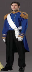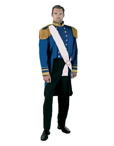 Includes: Dashing double breasted jacket w/tails opulently adorned w/gold trim, trousers w/seam pockets, sash & pin.